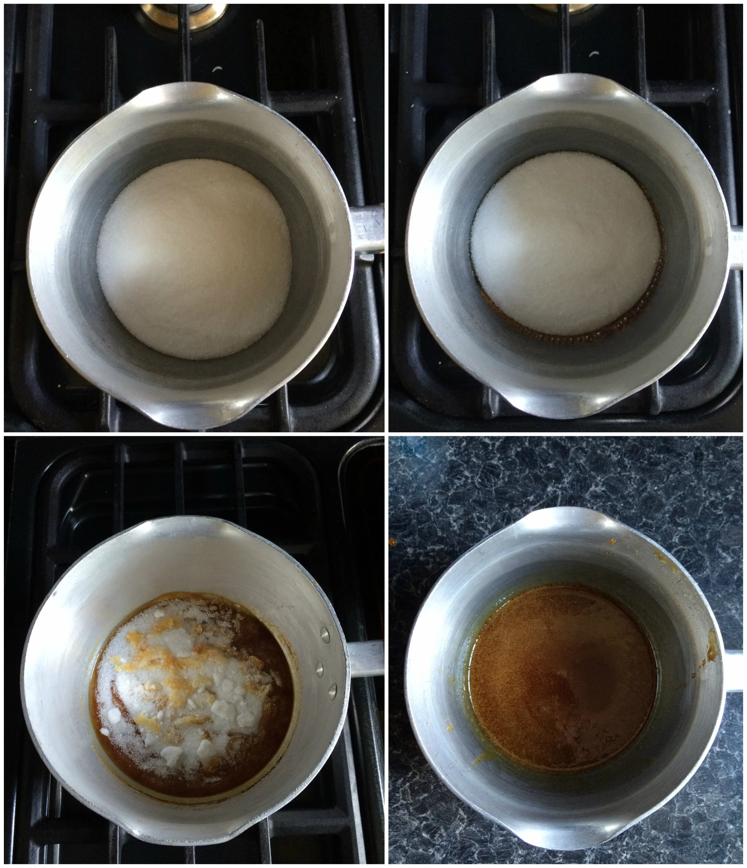 2. To make the caramel, place the sugar in a pan and heat. As the sugar heats up, the sugar at the edge of pan will start to turn brown. Using a rubber spatula or a wooden spoon move the caramelising sugar from the edge of the pan into the middle of the pan. Keep heating until all the sugar has melted and the sugar becomes a copper brown colour. Then remove from the caramel from the heat.