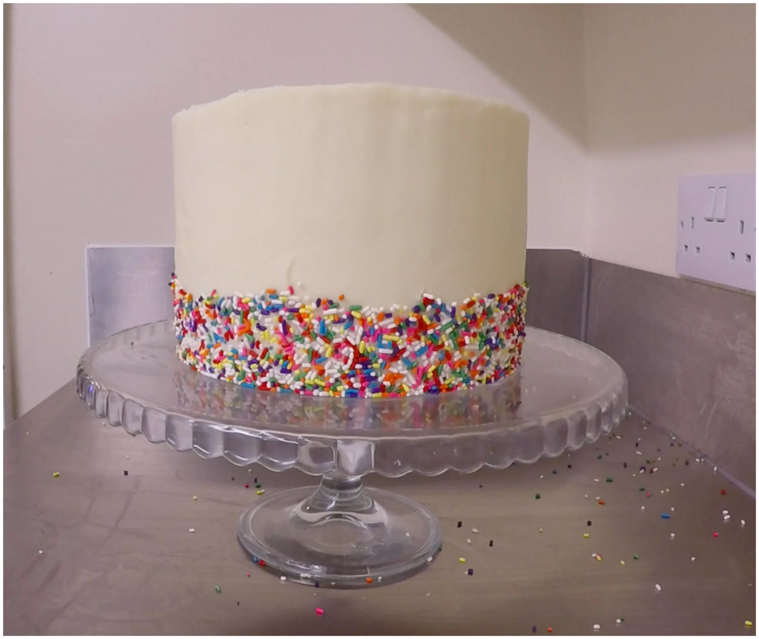 12. Carefully press the rainbow sprinkles/jimmies around the side of the cake.