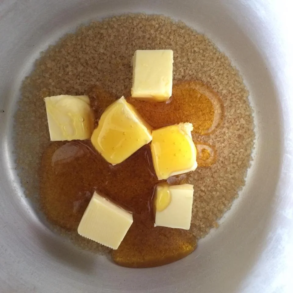 1. Add the butter, Demerara sugar/granulated brown sugar and golden syrup into a pan and heat on a low heat.