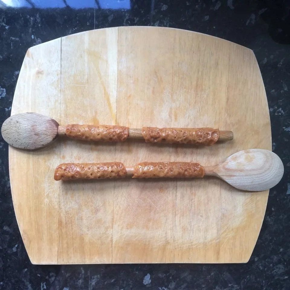 6. Leave the brandy snaps to cool for 1 minute, this will allow them to set slightly. Then roll the brandy snap around an oiled wooden spoon handle to create a tube shape. Repeat this process again until all of the brandy snap mixture has been used up.