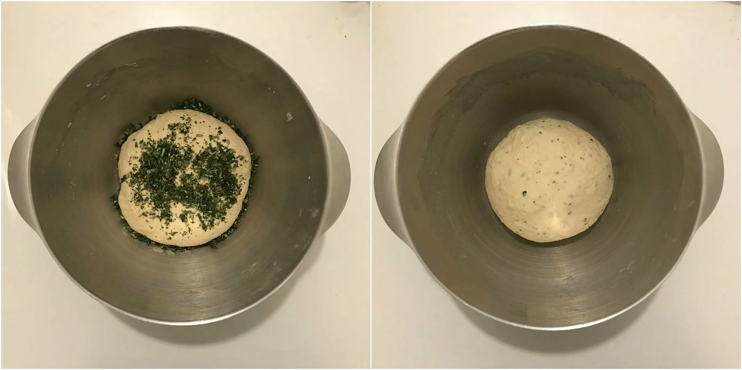 3, Next chopped the fresh herbs and add them to the dough and mix again until all of the herbs are evenly incorporated into the dough.