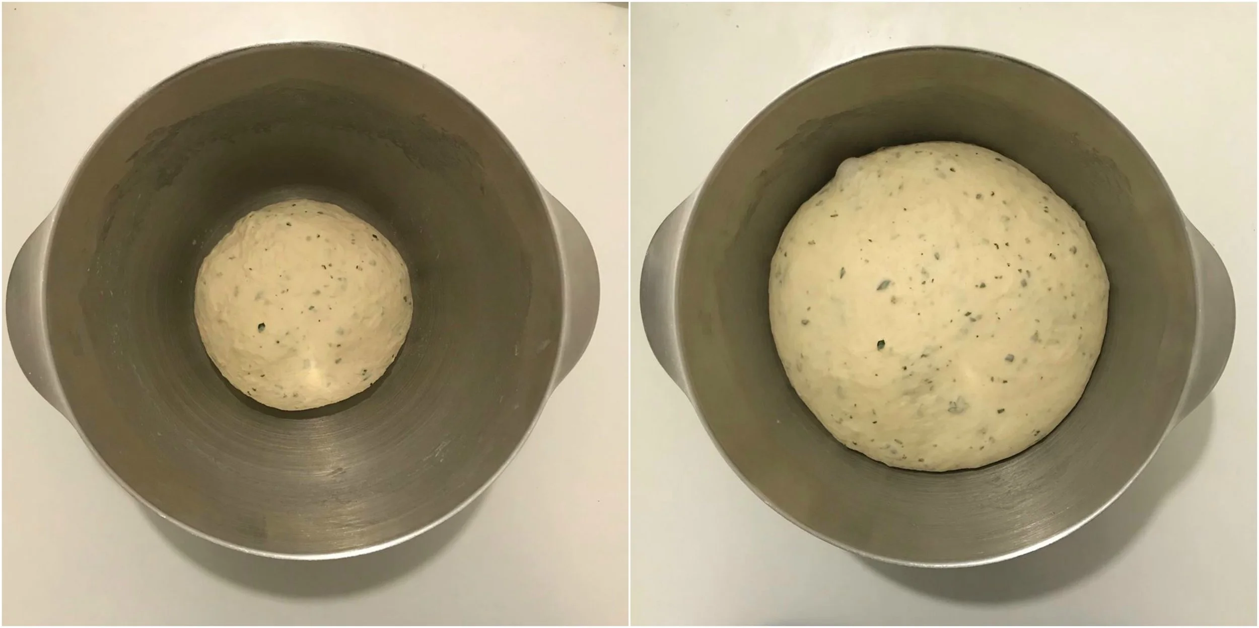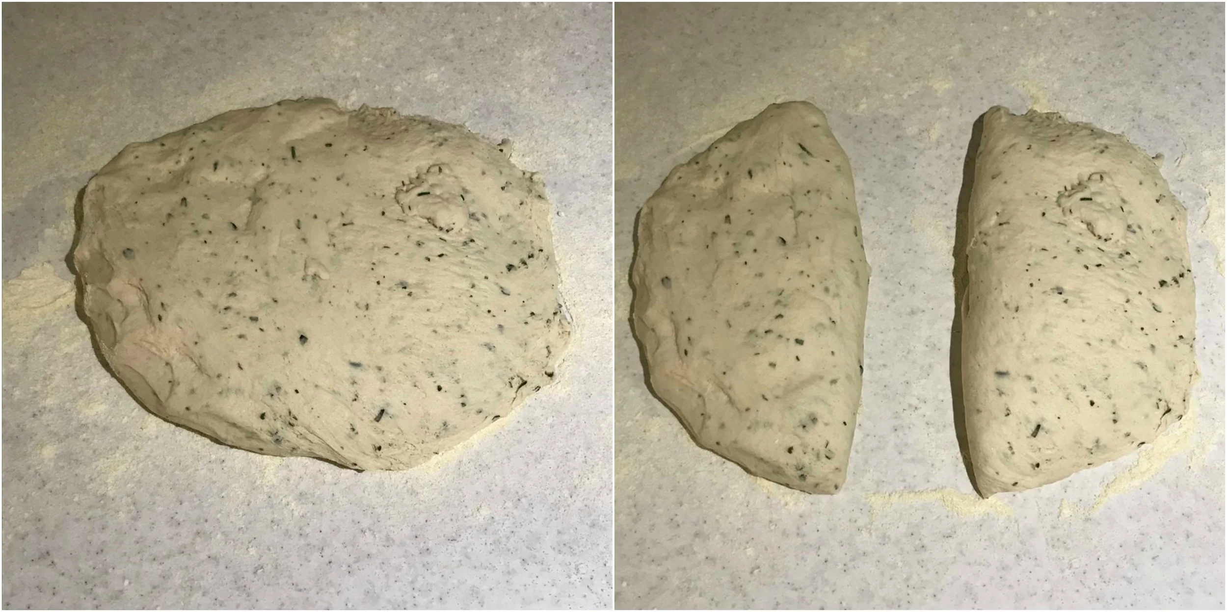 6. Once the dough has prooved tip the dough onto the work surface and divide the dough into two equal portions.