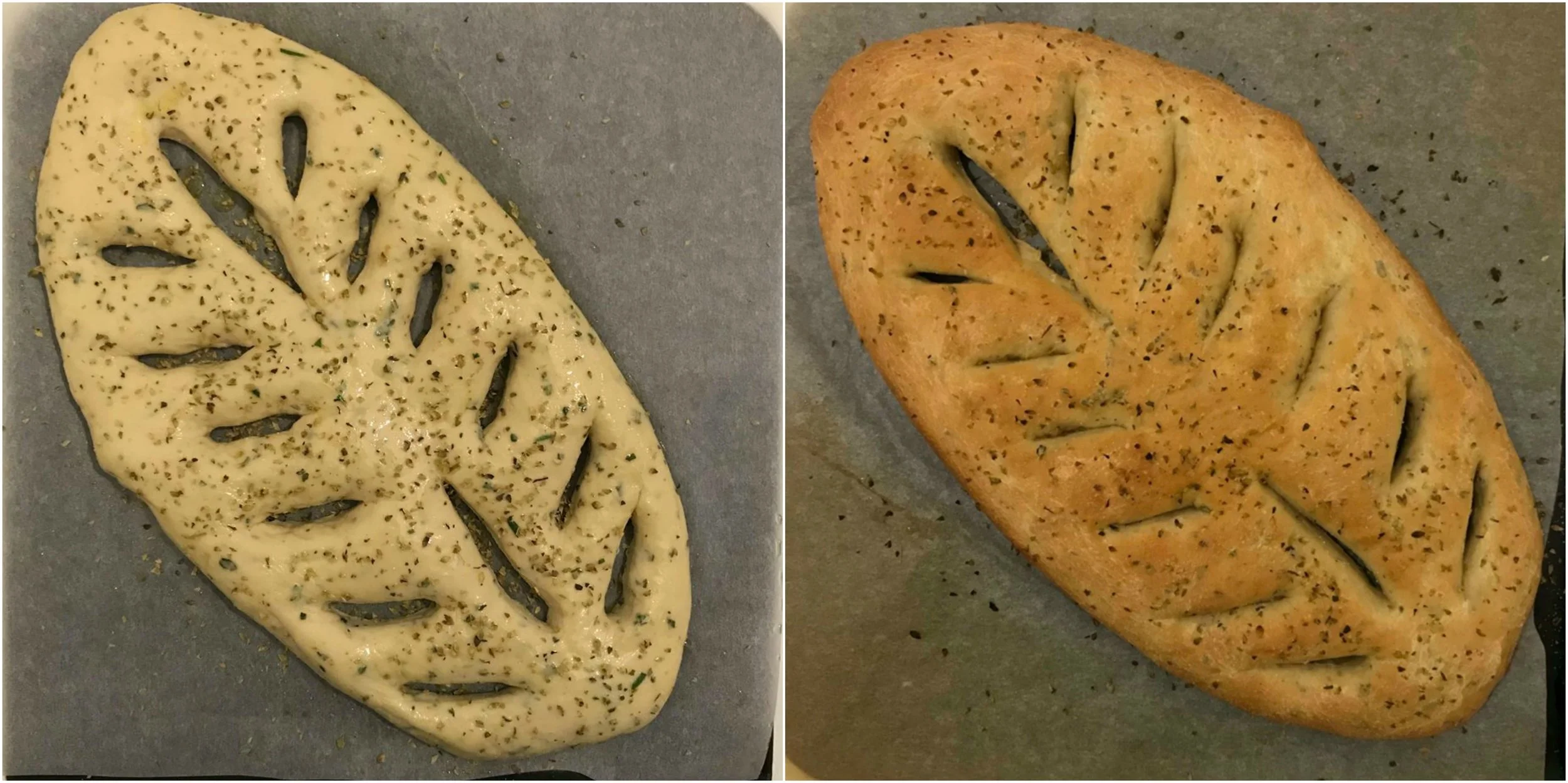 7. Lift each dough portions onto a baking tray lined with parchment paper. Spread the dough to form an oval. Then using a pizza cutter make two cuts in a line down the middle of the ovals with a gap between them, stopping 2cm/1in from each end. Then make 12 diagonal cuts in the dough, 6 either side of the central cuts, forming a leaf design, then stretch the dough out slightly to emphasize the holes.