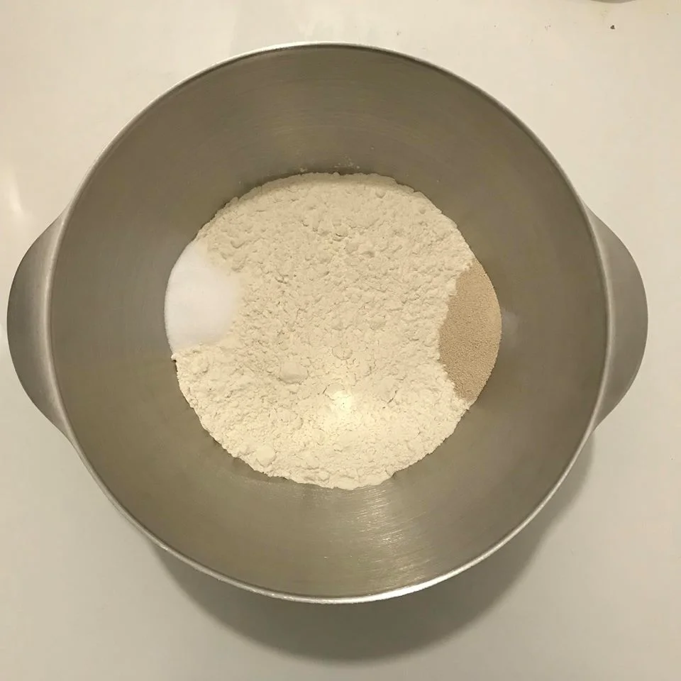 1. In a large mixing bowl add the flour, salt, and yeast. Make sure to keep the salt away from the yeast (this prevents the salt killing the yeast).
